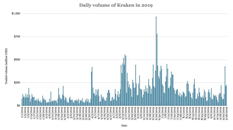 2019年Kraken日交易量 来源: The Block, CryptoCompare