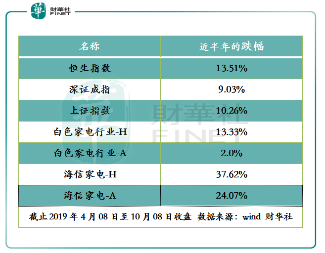 截至10月8日收盘,近半年,港股海信家电股价跌幅为37.62%,A股海信家电股价跌幅为24.07%。同期,恒生指数跌幅为13.51%,港股白色家电行业指数跌幅为13.33%;上证指数涨幅为10.26%,深证成指跌幅为9.03%,A股白色家电行业指数跌幅为2%。