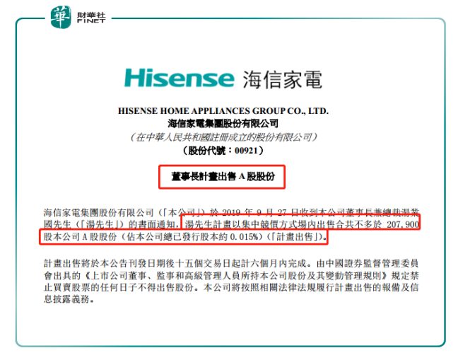 对此,财华社就此事致电海信家电,得到的答复均与公告给出的原因基本一致“董事长出售股份,是出于个人资金需要。”