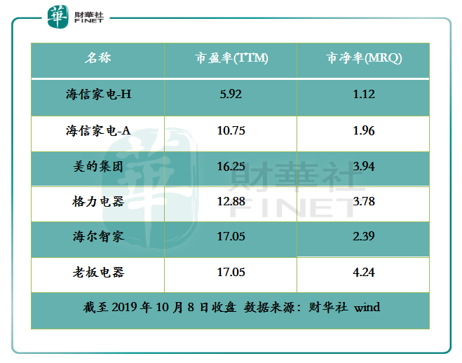 截至2019年10月8日收盘,H股海信家电的市盈率为5.92倍,低于近5年平均值的8.81倍,市净率为1.12倍,低于近5年平均值的1.99倍。反观A股市场的海信家电,市盈率为10.75倍,市净率为1.96倍,均处于近5年较低位置,且估值明显低于同行业竞争对手。