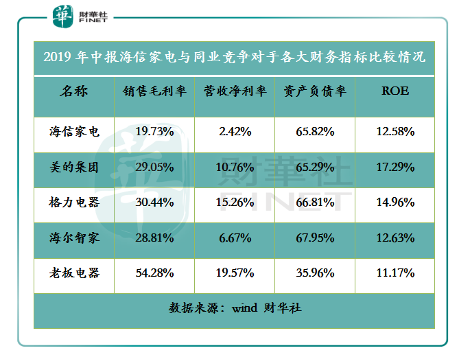 盈利能力弱于同业竞争对手。据Wind数据显示,2019年中期海信家电销售毛利率为19.73%,营收净利率为2.42%,与同业竞争对手(如下图所示)比较,两大盈利指标弱于同业竞争对手不少。资产负债方面,2019年中期海信家电资产负债率为65.82%,基本与行业头部企业美的集团及格力电器持平,并未出现负债端陡增的情况。