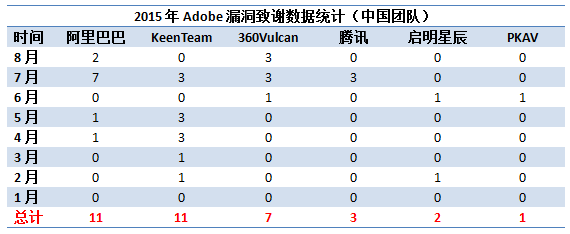 从统计来看,阿里巴巴在收购瀚海源之后在一定程度上弥补了软件漏洞研究的能力,11个漏洞大多是由原瀚海源团队成员提交给Adobe的;作为Pwn2Own黑客大赛上攻破Adobe产品的团队,KeenTeam在Adobe漏洞报告方面表现出色,今年迄今一共提交了11个漏洞,与阿里巴巴数量相同。360VulcanTeam从6月开始也将漏洞挖掘从Windows扩展到Adobe等更多系统和软件上,后续表现值得期待。