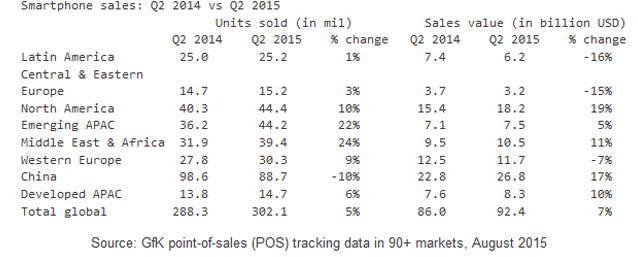 2015年第二季全球智能手机市场调查报告显示,由于苹果iPhone 6和三星Galaxy S6等高端智能手机销量走高,手机市场的整体销售额增长显著,售价高于3000元的高端智能手机市场占有率升至43%,全球智能手机格局呈现低端和高端两极分化。