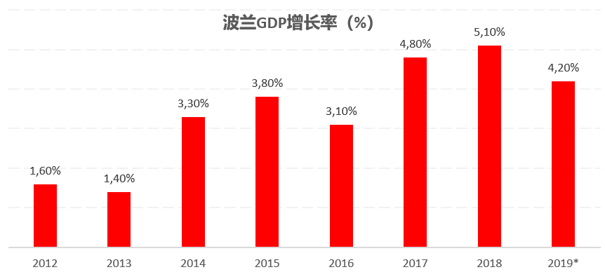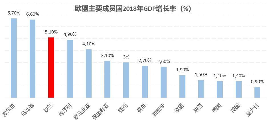 2015年以来,波兰的GDP增长率一直保持在3%以上,经济总量增长了20%以上。2018年,波兰凭借5.1%的经济增长率,不仅成为欧盟28国中增速第三高的国家,也巩固了其在欧洲新兴市场中第一大经济体的地位。