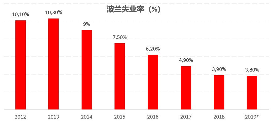 即便是在全球经济趋冷、德国和英国可能陷入技术性衰退的当下,波兰2019年的预计经济增长率仍能保持4.4%,失业率同样进一步降低至3.8%。波兰同样也是金融危机以来,十年内欧盟唯一一个经济从未陷入衰退的成员国。