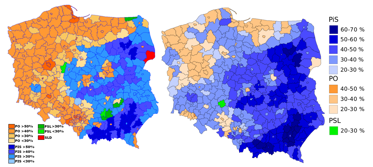 就如同2011年和2015年两次大选一样,波兰选民的政治倾向分野至今仍与地理环境高度重合。法律与公正党的主要选票来源依然是位于东部的相对贫困地区和农村选民,特别是该党许诺的儿童金计划对于该地区选民有着很大的吸引力。而在较富裕的、毗邻德国的西部地区,持有自由主义观念的选民仍占多数,而且进一步与其他欧盟国家、特别是德国进行经济上的一体化更符合当地利益。