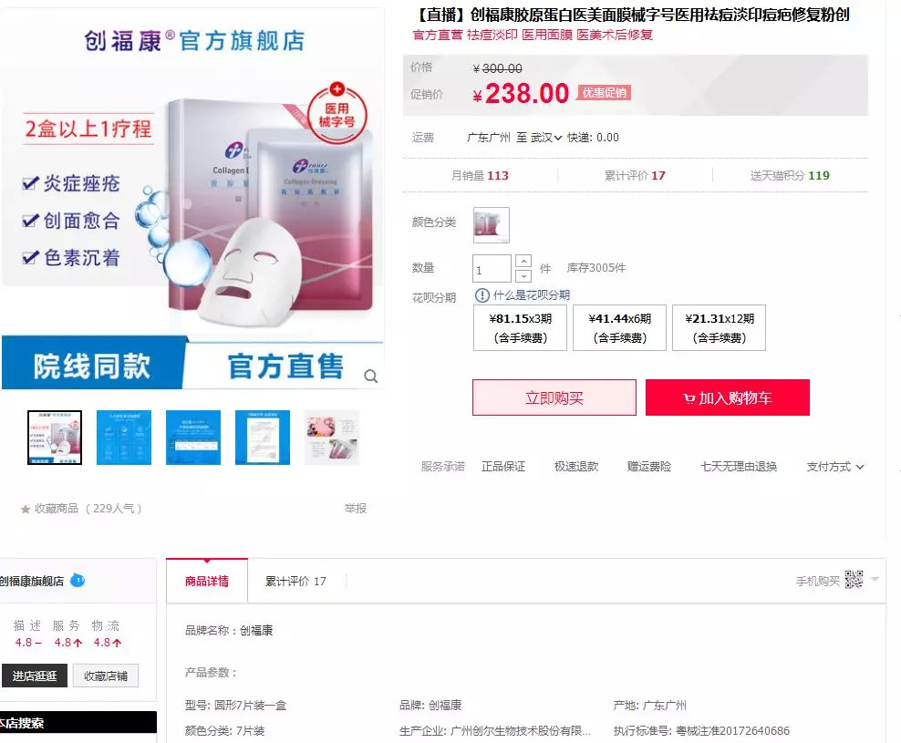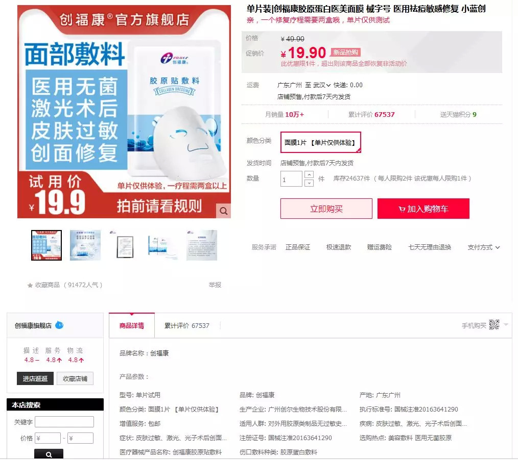 在天猫创福康旗舰店可查到,创福康的执行标准号分为国械注准和粤械注准两种,其中销量最好的当属单片装的胶原蛋白医美面膜,月销达到10万+,这款面膜的执行标准号为国械注准20163641290。