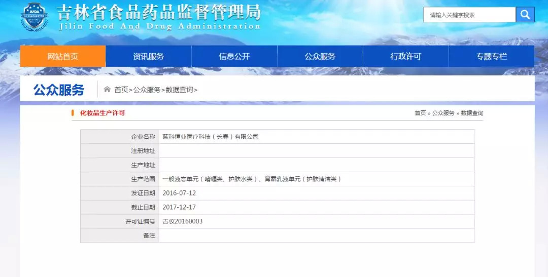 值得注意的是,“医美面膜”市场从一出生就饱受质疑。在今年年初青眼的调查中,不仅存在着妆字号面膜宣称医美或医用功效的违规情况,备案为械字号的面膜中,也存在夸大功效或误导消费者的现象。直到10月11日,卡卡调查发现,“浑水摸鱼”的情况依然存在。比如,宣称为“医美面膜”的芙芙面膜批准文号为“吉妆20160003”,根据该批准文号,吉林省药监局官网显示该企业的生产范围为“一般液态单元(啫喱类、护肤水类)、膏霜乳液单元(护肤清洁类)”。另外,该公司的生产许可截止日期为2017年12月17日,如今早已逾期。