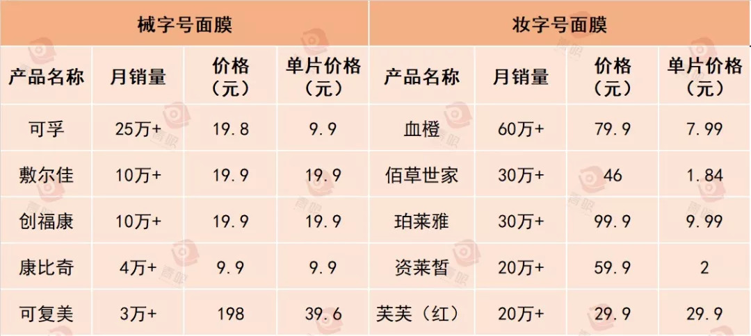 械字号面膜销量虽然还没有赶上妆字号面膜,但其整体售价相对更高。