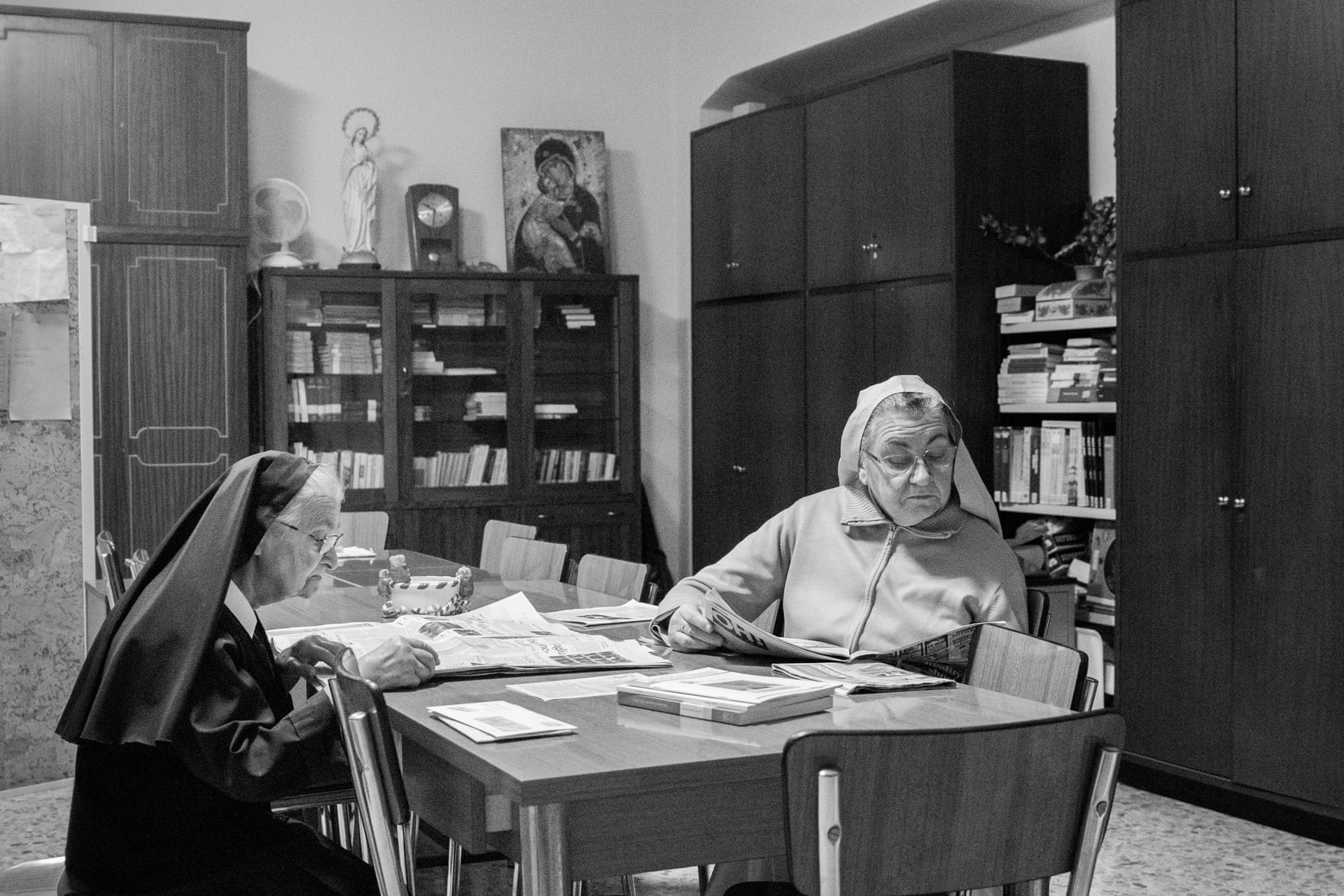 2015年,我开始了一项后来成为长期项目的工作——探索罗马的耶稣和玛丽圣心修道院(Holy Hearts of Jesus and Mary)修女们的生活。我的兴趣主要在那些过着“激进”生活人的故事上——她们决定脱离传统标准的生活,选择完全不同的生活方式。我在老家罗马附近散步的时候,经常看到修女们的日常生活。虽然这是那里常见的景象,但毕竟还是在修道院的围墙后不为公众所见。修女的生活需要什么?她们在修道院里的生活是什么样子的?罗马有超过750个女性宗教机构,这里正是找到这些问题答案的理想地点。