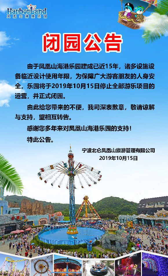 宁波北仑凤凰山旅游管理有限公司公告, 由于凤凰山海港乐园建成已近15年,诸多设施设备临近设计使用年限,为保障广大游客朋友的人身安全,乐园将于2019年10月15日停止全部游乐项目的运营,并正式闭园。