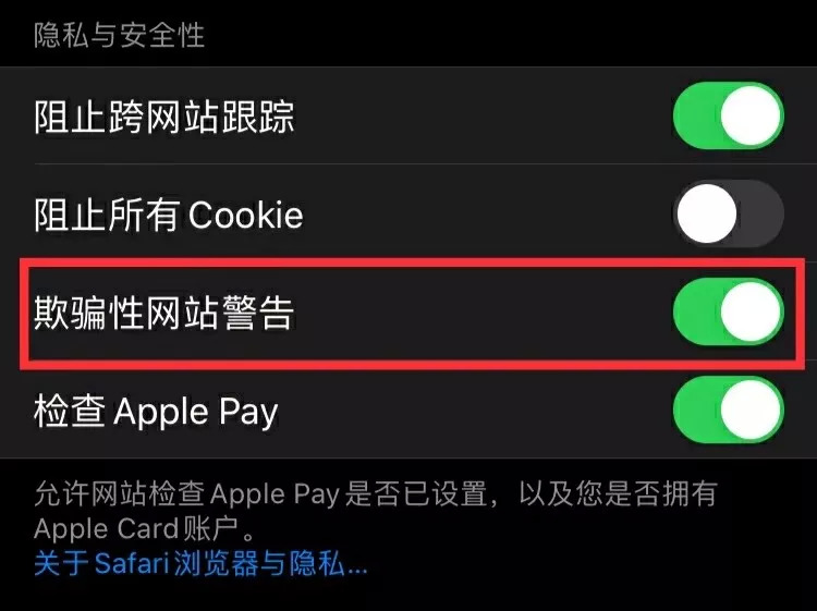 如果你担心隐私安全,可以在“Safari浏览器设置”中关闭“欺诈性网站警告”开关。一旦禁用,用户设备的IP地址就不会被共享,但苹果也将无法根据腾讯或Google的列表检查网站的安全性。