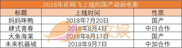 得益于Netflix等流媒体平台,中国的动画电影也在包括日本在内的海外市场播出。在2018年,有4部国产动画电影被网飞买下了播放权,分别是《大鱼海棠》《肆式青春》《妈妈咪鸭》《未来机器城》。