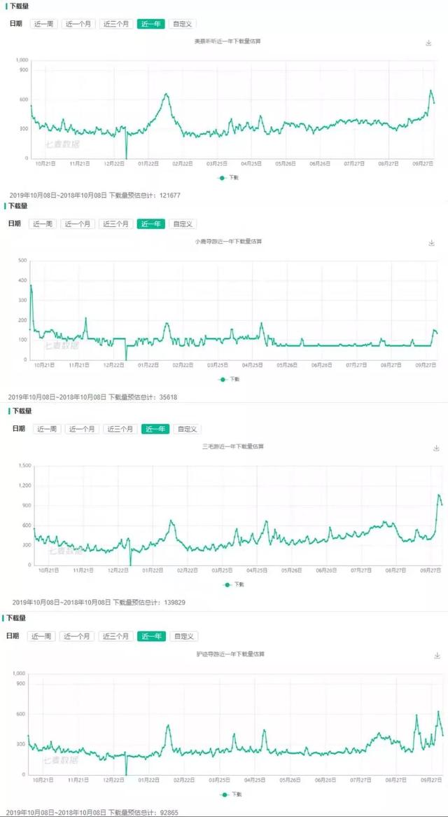 在苹果手机上,国庆7天假期驴迹导游的预估下载量为3510次,少于美景听听的4140次和三毛游的6122次,仅比口袋导游的3438次、以及小鹿导游的863次来得多。近一年的下载量显示,驴迹导游为9.3万次,也落后于三毛游的14万次,美景听听的12万次,口袋导游的11万次。
