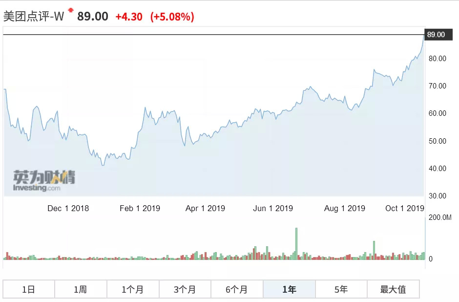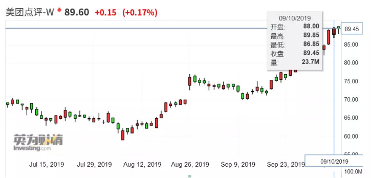 相比去年9月20日美团IPO当天市值483亿美元,约合人民币3437.41亿元,市值涨幅超过33%。2019年以来美团点评涨幅达103.6%,是中国所有大型互联网公司里面涨幅最好的。