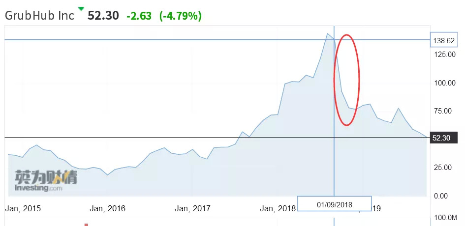 其次,行业竞争带动市场风向。Doordash在美国后来居上,总销量超过了传统的领导者GrubHub,2018年DoorDash推出的订阅模式,占领了按需配送市场的27.6%。随后,即使Grubhub还是保证每年40%的收入增速,市场份额极其敏感地带动着Grubhub的股价,造成了长时间内的下跌行情。