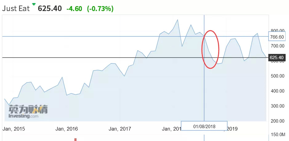 美团外卖和饿了么的竞争更像是Just Eat在英国遇到的Delivery。Delivery的优势在于拥有强大的资金支持,助于其在进入新市场时承担高昂的竞争成本。2019年5月,该公司宣布了由亚马逊领投的5.75亿美元的G轮融资,截至目前其融资总额达到13.5亿美元。从2018年Q4开始,市场份额被Delivery分了一杯羹的Just Eat,因为市场持悲观预期,早在Q3时期,其股价开始有下跌趋势。