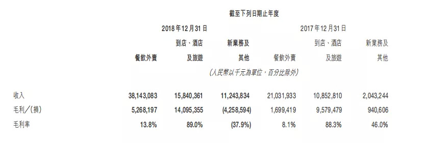 从两大核心业务看:占总营收一半的餐饮外卖业务市场份额持续领跑,2018年餐饮外卖营收为381亿元,同比增长81.4%,行业头部的马太效应持续放大。2018年到店、酒店及旅游收入为158亿元,同比增长46%,营收增速也加快。