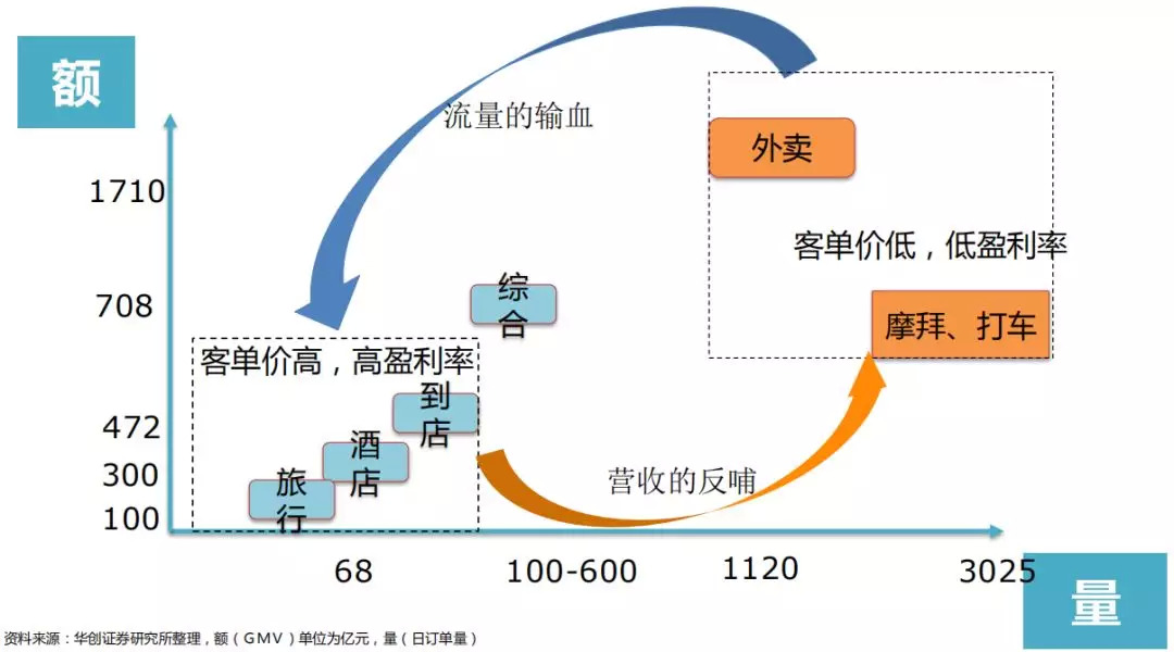 摩拜单车、美团打车等出行业务虽然在短期内难以取得规模化的盈利, 但是由于本地生活服务具有位置属性,将扫码用车方式迁移至美团APP内,作为补足美团本地服务生态链进攻型战略的一环,出行业务能增强用户消费频次,提高用户对于美团平台的消费粘性更具意义。
