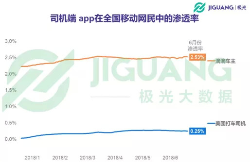 司机端应用的表现也可以透露出网约车平台的一些运营情况。根据极光大数据的统计结果,截至去年6月份,美团打车司机端在全国移动网民中的渗透率为0.25%,而滴滴车主则达到2.53%,约是美团打车10倍。