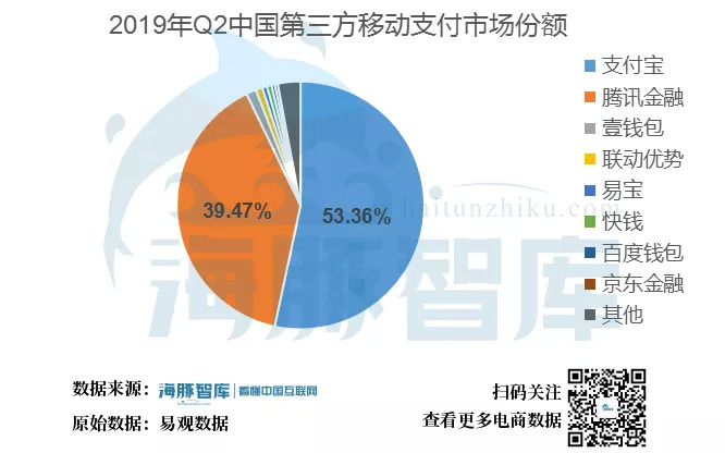 易观数据发布的《2019年第2季度中国第三方支付移动支付市场季度监测报告》数据显示:2019年第二季度,中国第三方支付移动支付市场交易规模达490984.6亿元人民币,环比升高2.93%。其中,支付宝以53.36%的市场份额继续夺得移动支付头名,腾讯金融第一季度市场份额达到39.47%,位列市场第二位。