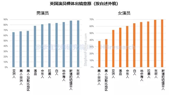 在专业排名网站上,演员需要说明其“外貌”,例如“白人”,“地中海地区”,“西班牙裔”等。通过查看十个最常见的选项,我们可以看到与裸体出镜意愿间的相关性。那些自称“斯堪的纳维亚人”或“东欧人”的演员对裸露出境最为开放,那些自称“黑人-非洲人”、“黑人加勒比人”或“亚洲人”的则相反(其中亚洲人的意愿最低),男女都一样。