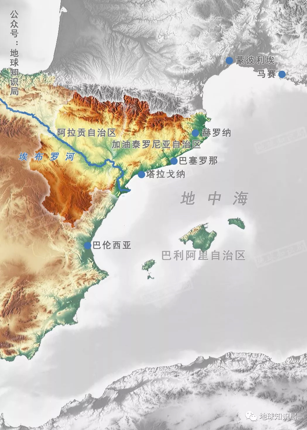 加泰罗尼亚所在的位置,对应的地理单元是埃布罗河下游平原。埃布罗河是西班牙东北部的母亲河,在它的中游,就是加泰罗尼亚曾经投奔过的阿拉贡地区。同处一条大河的上下游,让加泰罗尼亚和阿拉贡产生了很高的亲缘性,才能在联姻中和平地统一在一起。