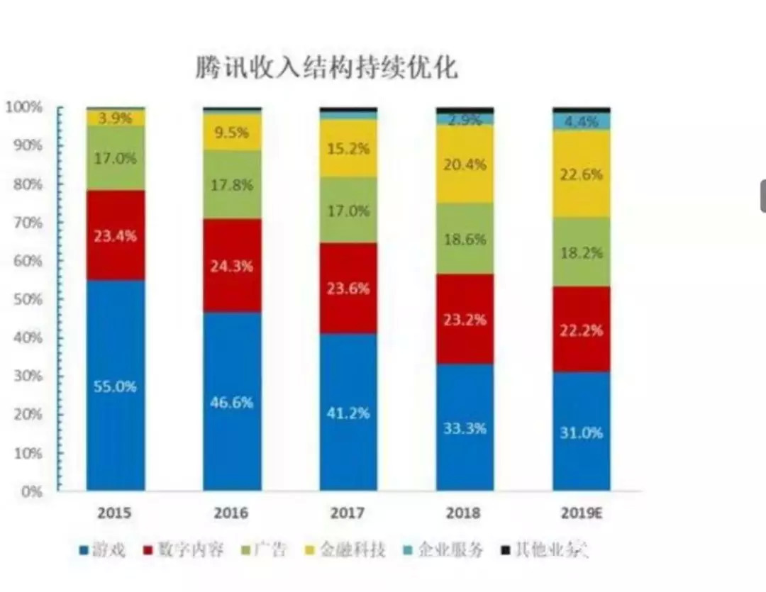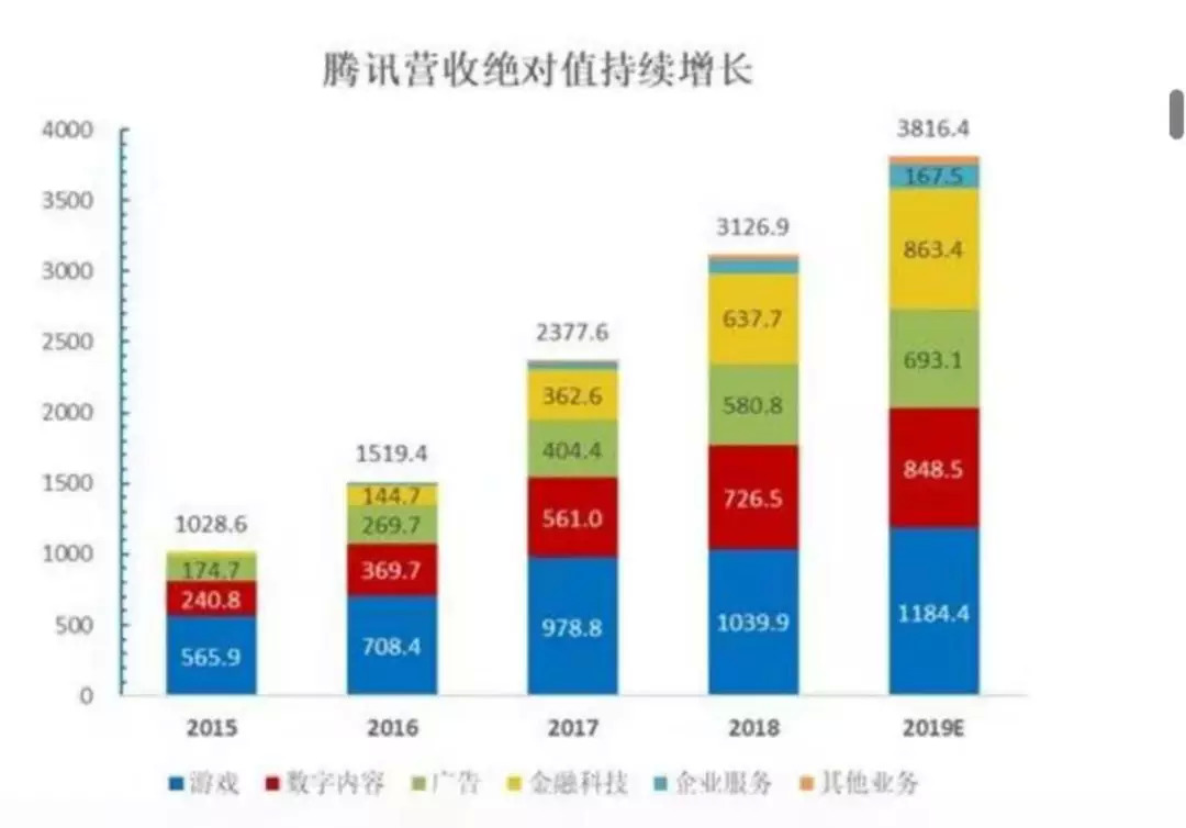 腾讯的业务模式核心构建中国网民的社交关系链以此聚集起了海量线上注意力和用户时长,腾讯再依靠自身产品开放能力不断从流量之中变现。马化腾曾经把腾讯主营业务概括为“2个半”即“社交+内容”以及与生态合作伙伴的“半条命”(开放策略)。除了游戏、增值业务收入以外,腾讯内容生态所产生的IP版权费用以及广告收入亦不可忽视,而在财报之中腾讯所投资生态公司还未完全计算其中。