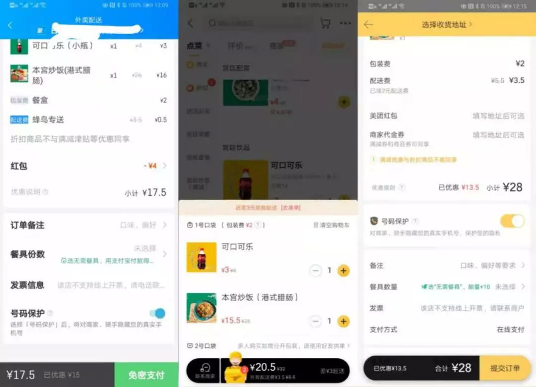 (左图为饿了么下单17.5元,中图是饿了么同款菜品满20元起送另外加3.5元配送费,右图是凑足20元之后下单,尽管美团下单称已优惠,同样店家菜品但比饿了么贵了9.5元,扣除凑单的3元,这一单美团比饿了么贵了6.5元,作为理性消费者我肯定选便宜的)
