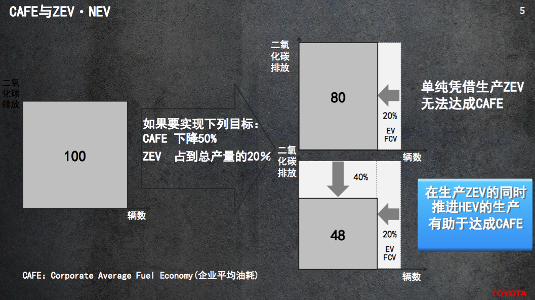 丰田公布的一组研究数据也证实了这一点。CAFE(平均油耗限值)法规需要企业平均油耗到2025年前降低50%,并且ZEV(零排放汽车)产量占比达到20%。而根据丰田测算,仅依靠将纯电动车(EV)或燃料电池车(FCEV)的产量占据总产量的20%,并不能实现50%的平均油耗缩减。但如果再加入40%比例的混合动力车型(HEV),就能将平均油耗缩减至原来的48%。