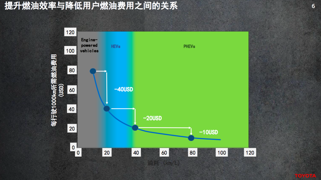 以此为基础,丰田给出了另一组数据。当汽车的燃效水平从10公里/升提升到20公里/升时,每行驶1000公里所需的燃油费用将从80美元降低到40美元。但当燃效从20公里/升,提升到40公里/升后,每1000公里的燃油费用仅从40美元减少到20美元。