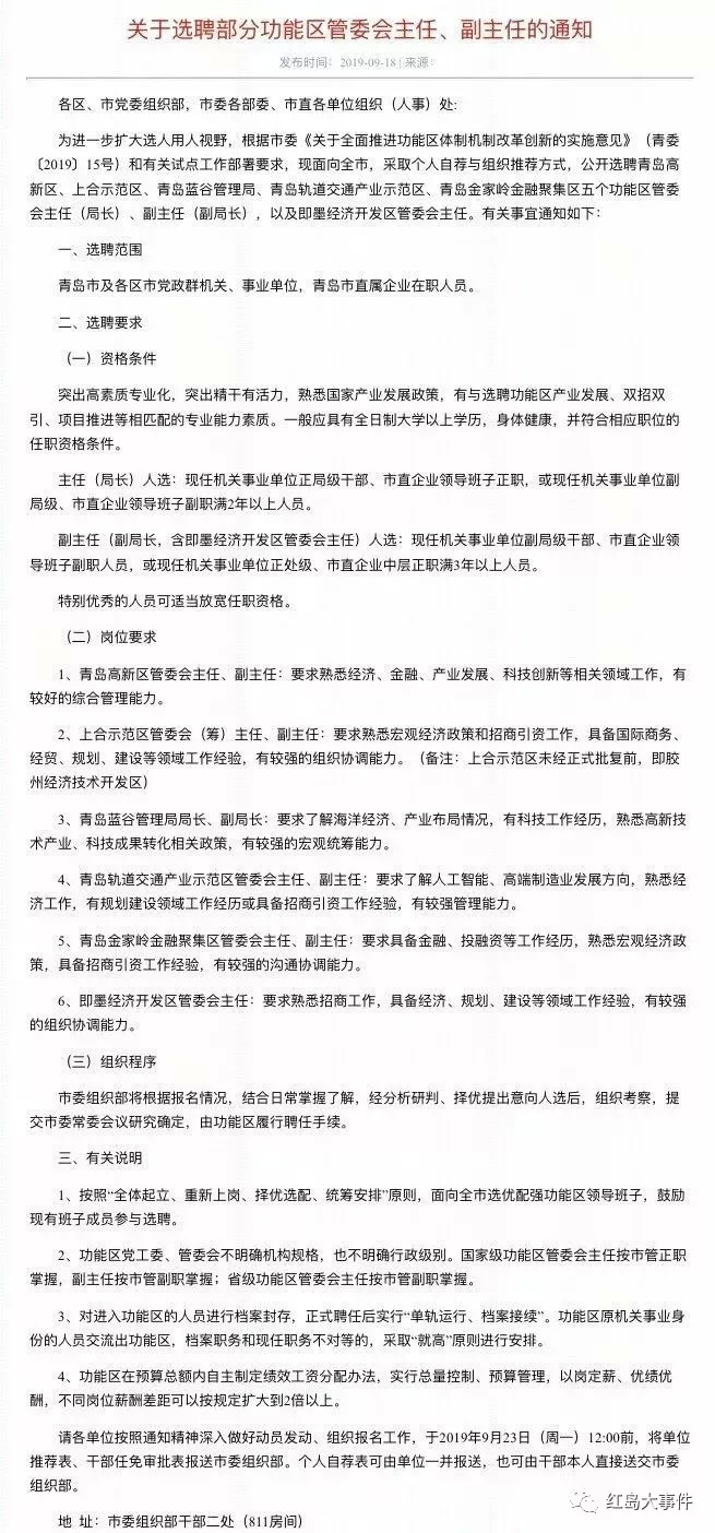 像本次青岛开发区改制,并非红岛高新区一家,上合示范区、青岛蓝谷管理局、青岛轨道交通产业示范区、青岛金家岭金融区、即墨经济开发区都位居其中,且已经公开选聘管委会主任、副主任。