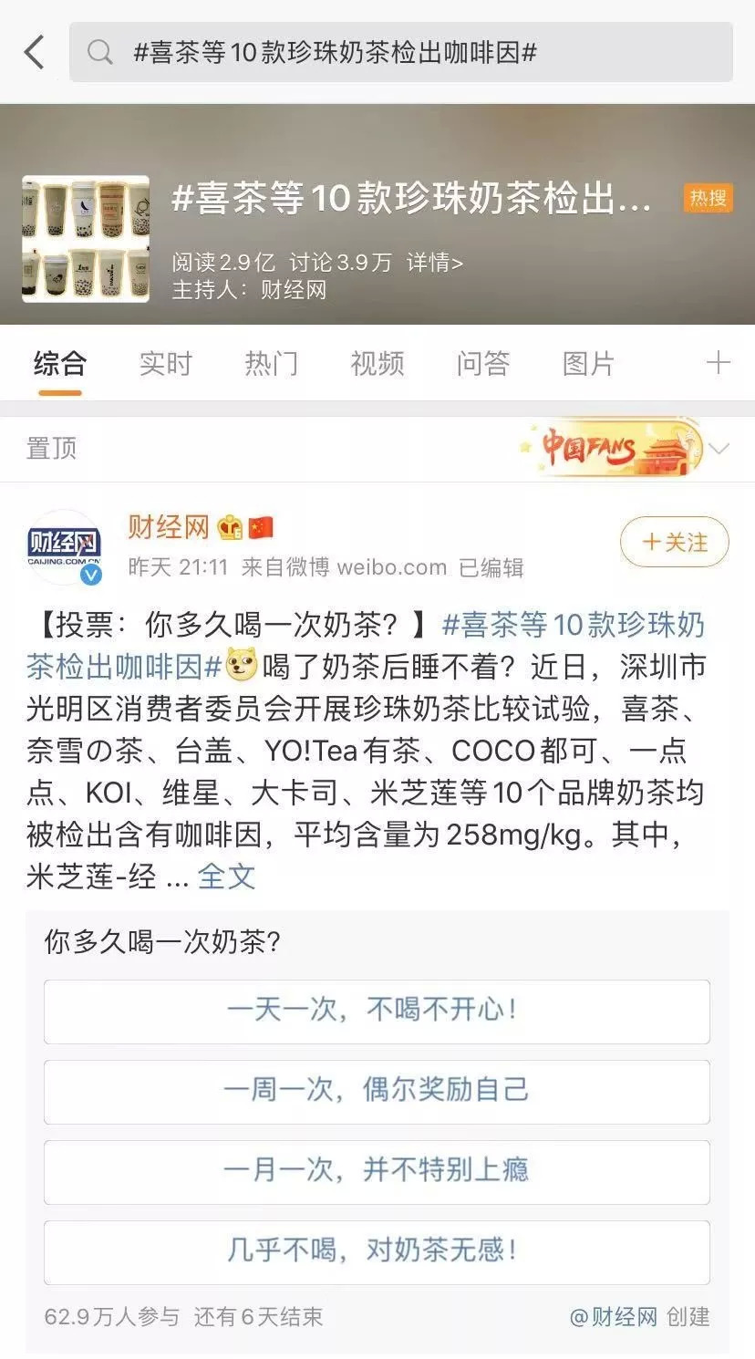 昨天#喜茶等10款珍珠奶茶检出咖啡因#登上了微博热搜。