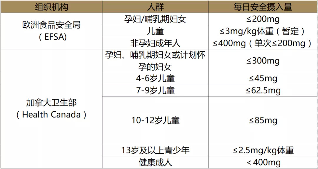 根据上表,孕妇及乳母每日摄取咖啡因不超过200mg,健康的成人应在400mg以下。