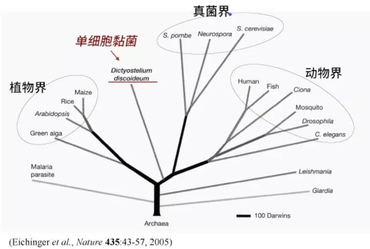 生命树,黏菌介于动植界、真菌之间,是一个“异类”。(图片来源www.google.com)