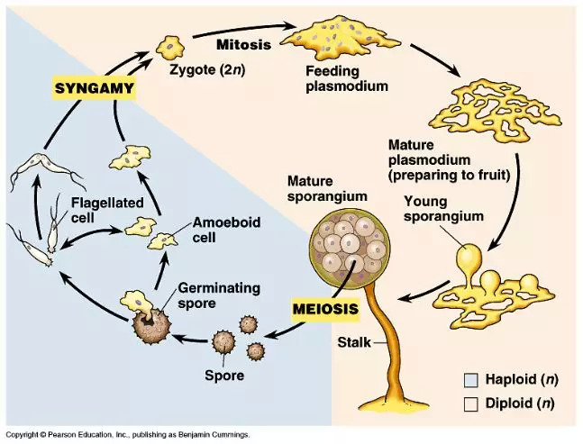 处于营养期时的黏菌是一个单细胞的变形虫态,靠延伸的原质体去到处寻找食物。但是,饥饿会触发黏菌聚集,进入繁殖期,在潮湿、阴暗的环境会触发黏菌形成子实体。子实体由孢囊与孢囊柄组成,孢囊里产生的就是孢子——黏菌后代。