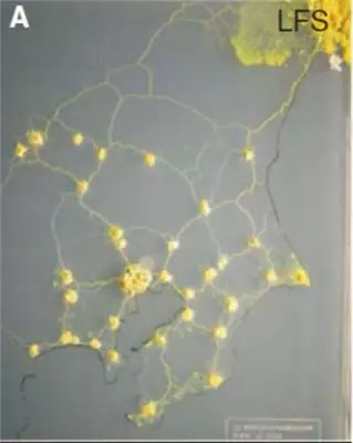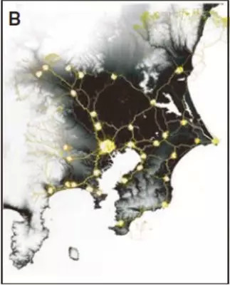 科学家把东京部分等比例缩小到培养皿中,然后在培养皿上对应东京附近重要的地铁站的36个位置放上食物,用黏菌避光的特性,用光斑模拟海岸线和地形,这样黏菌能组合出不同路径的路线来连接食物。