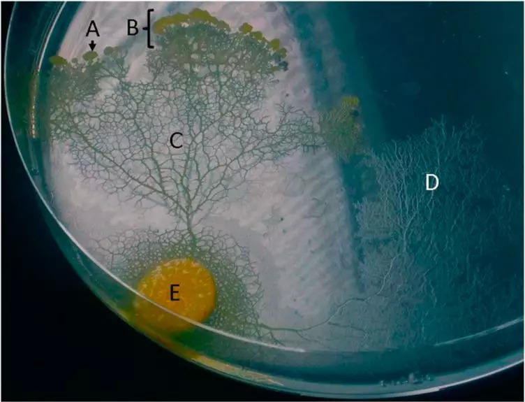 黏菌并没有一开始就算出最简单的路径,它采用的是穷举法,靠伸出去的原质体进行大面积全方位的搜索,利用化学物质标记每条路径,然后只保留其中传输效率最高的路径来连接食物,其余的路径就“放弃”掉,毕竟这样能最大化地利用食物,增加自己的觅食效率,因此它的记忆能力更像是反复试错的结果。