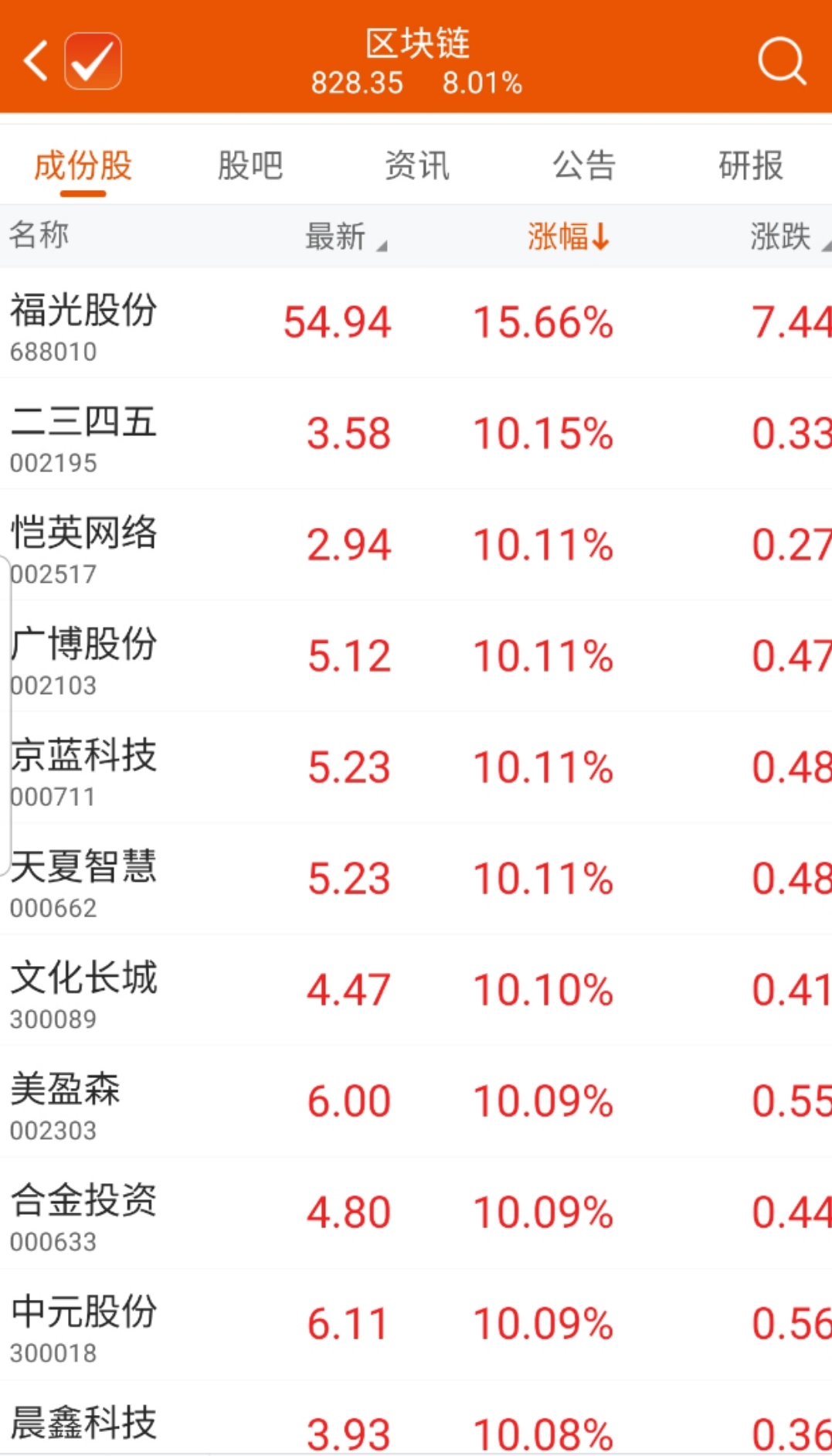 截止界面新闻发稿,福光股份涨逾15%,二三四五、恺英网络、广博股份、京蓝科技、天夏智慧、文化长城等近百股封涨停板。
