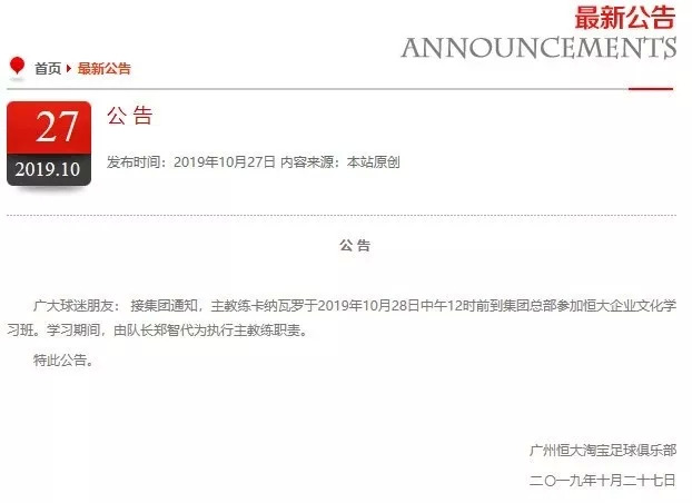 在恒大俱乐部历史上,官方网站从未针对主教练发布过参加企业文化学习的通知。无论是李章洙、里皮还是斯科拉里,都未发生过类似情况。