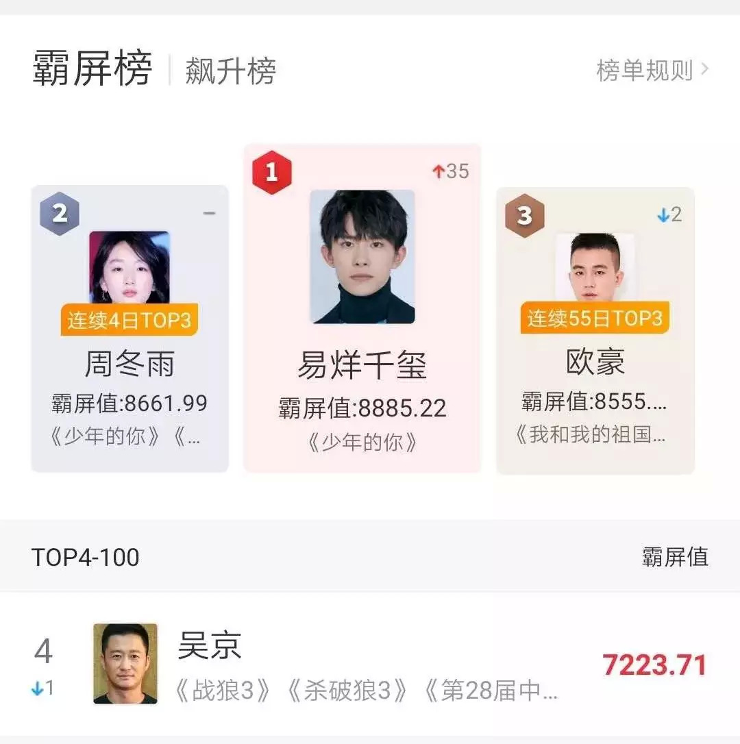 而电影中的两位主演,易烊千玺和周冬雨也因在其中超越满分的表现,得到了观众们的认可。在猫眼综合榜上,两天内,易烊千玺和周冬雨蹿升到了榜单的一、二位。
