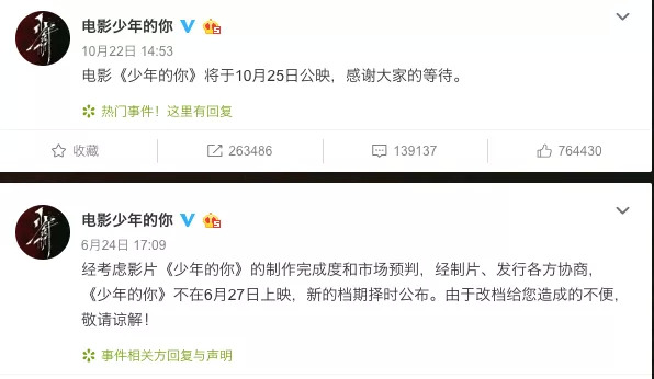 2019年,6月24日,《少年的你》官微宣布,由于制作完成度和市场预判,经制片、发行各方协商,《少年的你》决定改档。