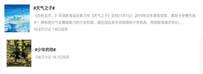 在微博上,《天气之子》总体话题阅读量1.6亿,话题讨论度10.8万,而《少年的你》阅读量则高达19.7亿,讨论量136万。可见,日本动漫电影,无论是在类型上,还是地域上,受众都存在局限性。而一部电影若想成为爆款,还需全民力量推动。