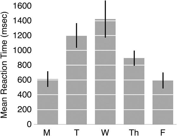 而在那些说对了“今天是周几”的人当中,说出“今天是周三”平均要用1400毫秒,比说出“是周一”和“周五”所要的时间多了一倍。准确说出“是周二”(1200毫秒)和“周四”(900毫秒)也需要比较长的时间。