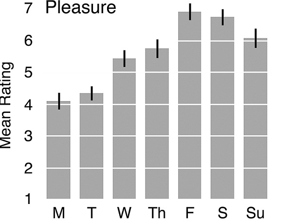 在心理上,大家对于周一和周五的感情是最强烈的。周一的快乐度最低,随着时间推移逐步增加,到周五达到最高,甚至比周末还高。在情感联想上,周一、周五和周末是最丰富的,而周二、周三和周四则没有明显的区别。