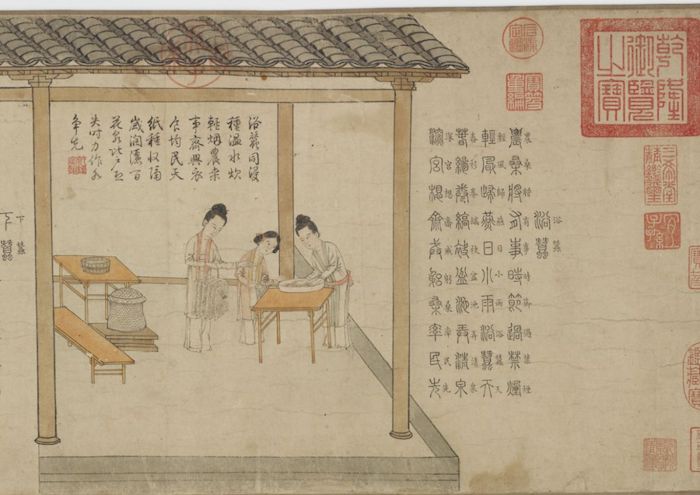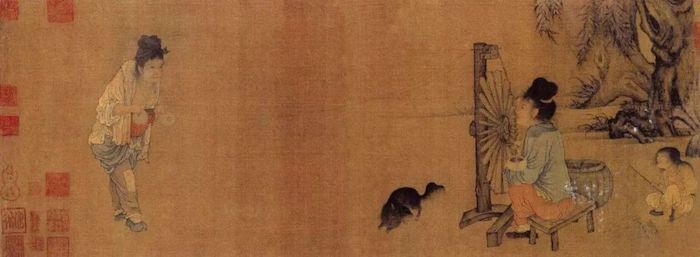 如同皇帝在春耕仪式上开犁,皇后则带领宫廷女眷举行先蚕礼,象征着母仪天下,起着女织的示范作用,这也表明了女性纺织与男性耕种的性别分工和同等的重要性。代代相传的《耕织图》最具典型性,其中耕种和纺织的插图各占一半,自南宋楼璹的最初版本到元明清几朝的各种版本,都可以看到历代“劝农”“劝桑”思想,还有一些版本是在皇帝亲自督促和参与(如题字、写序)下完成的。农书和中国画亦可看到类似的思想表达,巫鸿《中国绘画中的女性空间》有一章专门探讨了与纺织有关的画幅,从出土文物纹饰到耕织图再到院体画,对象包括农妇、贵族和皇室女性,体现出纺织在道德教化、礼仪象征、物质经济等各方面的重要意义。纺织可以在农闲或家务事、照看孩子之余去做,丝毫不会影响女性的其他家庭劳作。例如,南宋王居正(传)的《纺车图》(故宫博物院藏)描绘了贫困的婆婆和儿媳一起纺织的场景,画中的儿媳一边给怀里的婴儿喂奶一边摇着纺车,大一点的孩子在一旁玩耍——养育后代与纺织两不误。