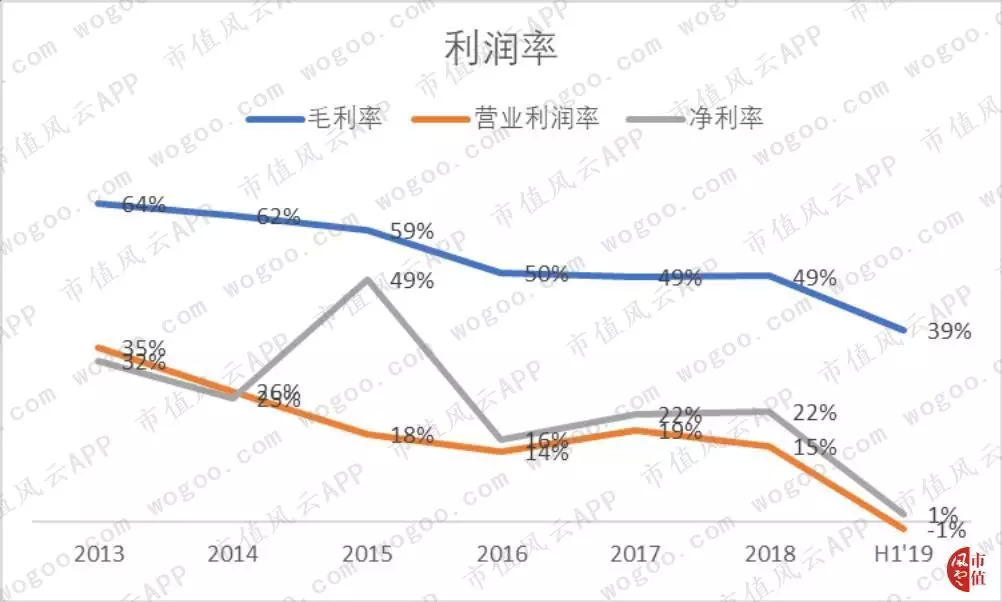 2013年公司毛利率高达64%,而到2019年上半年,仅为39%,越来越不像一家货真价实的高科技公司了。