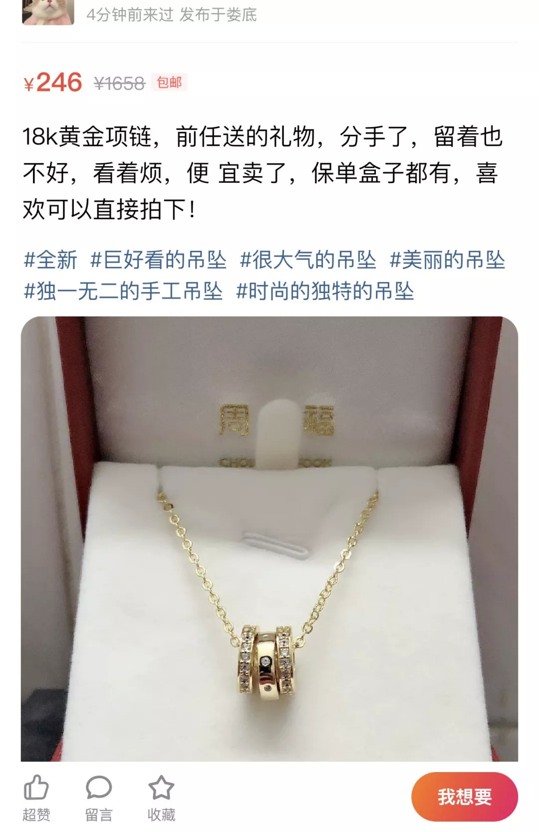 如下图中的项链,文案写的是前任送的礼物,分手了,留着也不好,便宜卖了,看着一副很惨的样子。