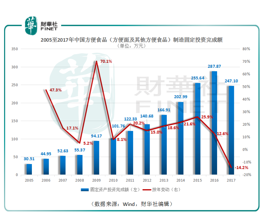 据Wind援引中国统计局的数据显示,2005至2016年整整十二年间,中国的方便食品(方便面及其他方便食品)制造固定投资完成额呈逐年递增的态势,直到2017年出现十三年来首次下降,并且降速高达14.2%。