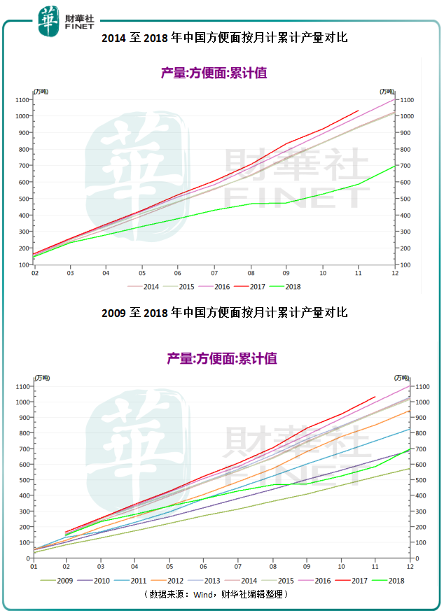 (*注:因Wind数据库2017年12月的中国方便面产量累计值缺失,这里使用前瞻产业研究院的2017年中国方便面产量1103.02万吨数据计算)